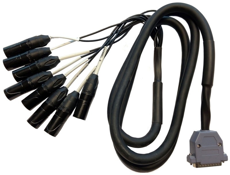 Multikabel av god kvalitet med 8 stk balanserte XLR-hanar i metall med avlastning i den ene enden og en 25-polig D-subhane i den andre.