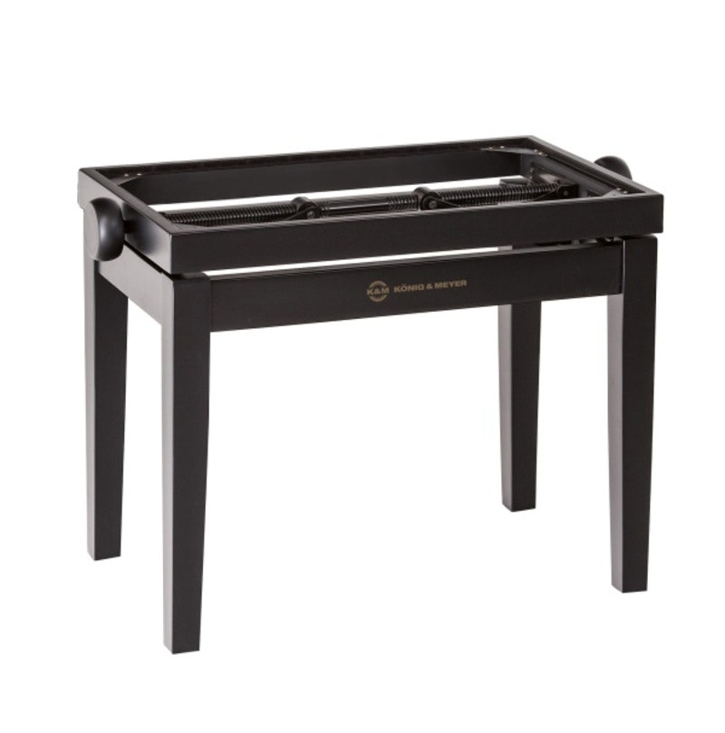 Piano bench med treramme. Solid europeisk bøk, lakkert med fire lag polyester. Støtteben med ikke-glidende gummiknotter. Dobbelt tverrbjelke-mekanisme for enkel og presis høydejustering. Piano bænken leveres flatt og er enkel å montere.