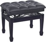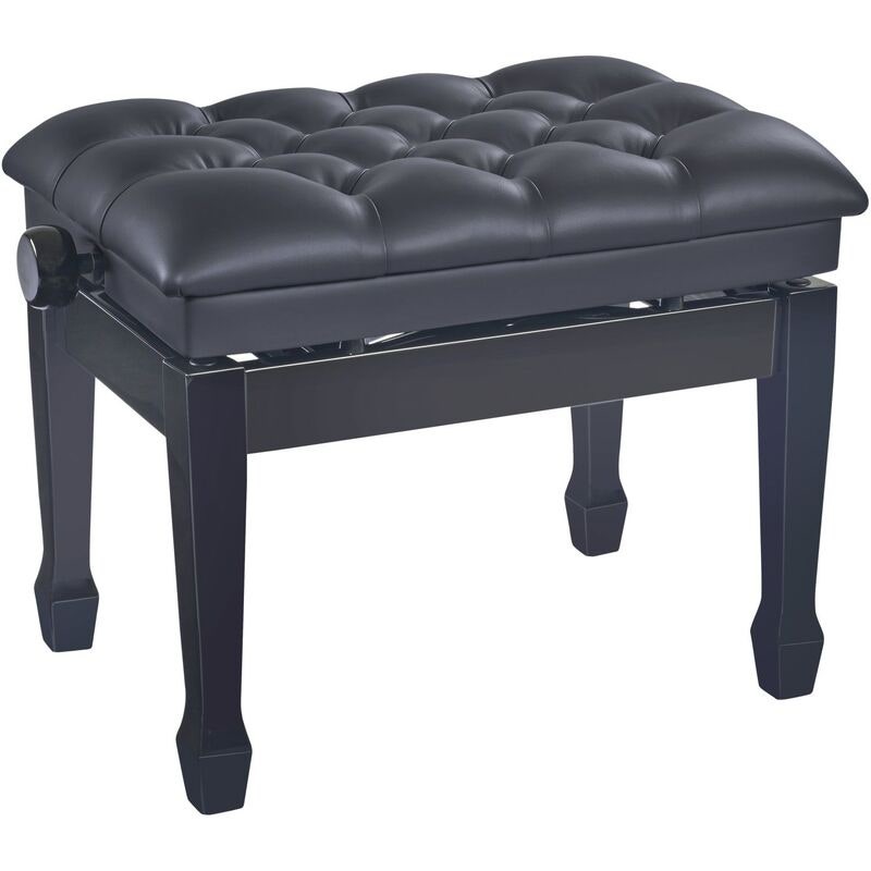 This exclusive and comfortable piano bench with large cushion is equipped with high-performance pneumatic springs. The continuously adjustable height from 490 to 590 mm is also ideal for use in music schools. The high-gloss black finish and the quilted upholstery, measuring 600 x 400 mm, made of black imitation leather ensure an attractive appearance. Leveling feet ensure a wobble-free and secure stand.