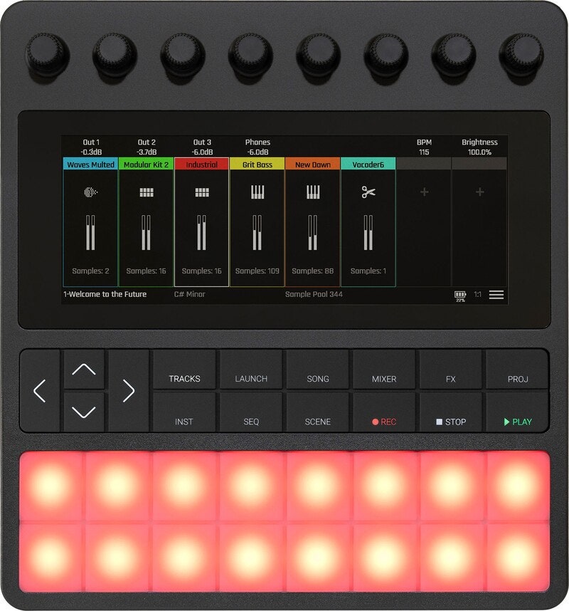 Artikkelnummer 1091196Sampler/synth/sequencer, 7" pekskärm, 16 pads, 24-bit ljud, scenbasert sequencer, stereo in/ut, USB-C, MIDI in/ut via Mini-TRS, innebygd batteri 3t
