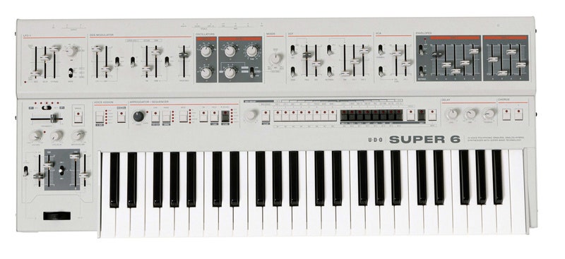 Artikkelnummer 1080907Super 6 er en 12-voice polyfonisk, Binaural Analog-Hybrid Synthesizer med 49-tangenters Fatar-klaviatur med Velocity og Aftertouch