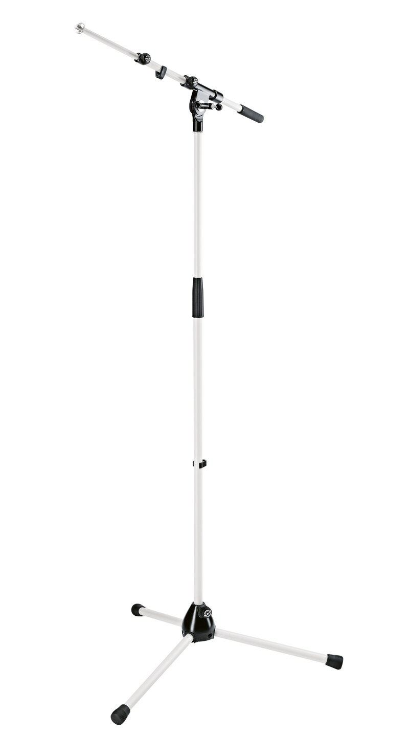 Artikkelnummer 1059847Hvit 2-delt mikrofonstativ med lange sammenleggbare ben og 2-delt bom.