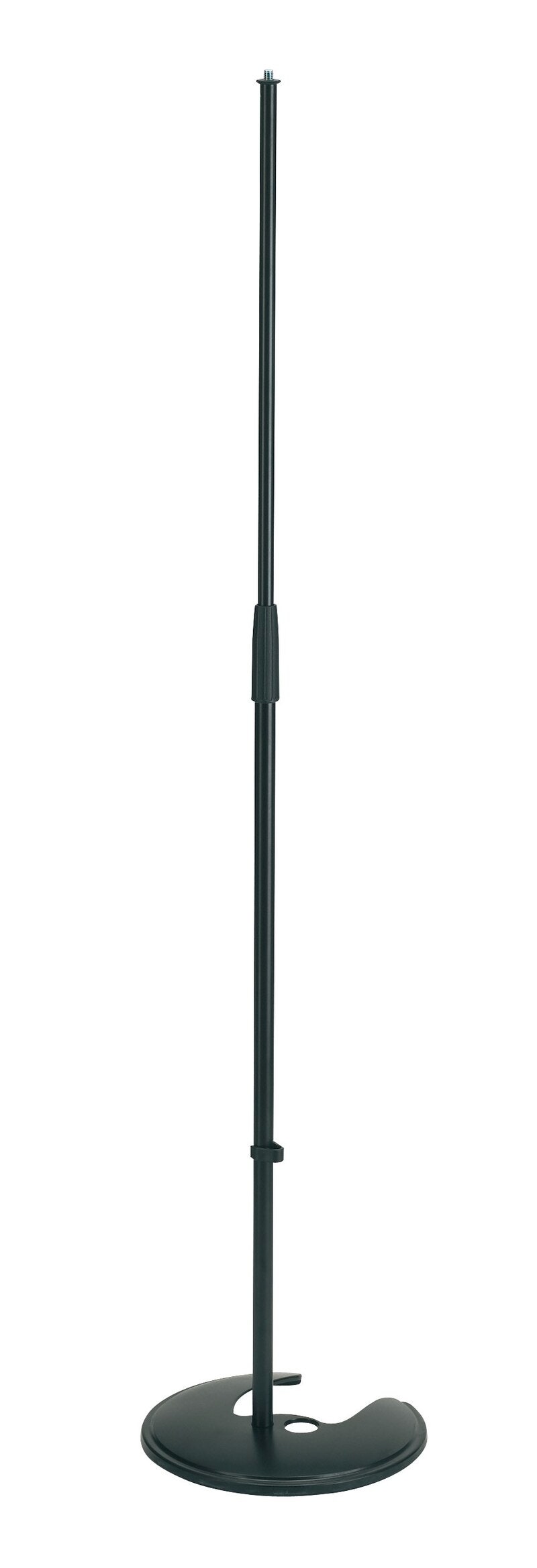 Artikkelnummer 10655812-delt mikrofonstativ med støpt rund fot i cutout-utførelse som muliggjør stabling av opp til fem stativ. Sort.