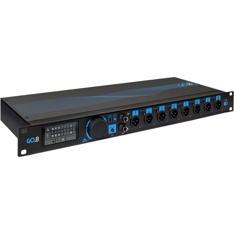 GO.8 er en automatisk veksler for backup av lyd, video og MIDI. Den kan automatisk veksle mellom to lydsystemer med 8 kanaler hver, to videokilder og to MIDI-enheter.