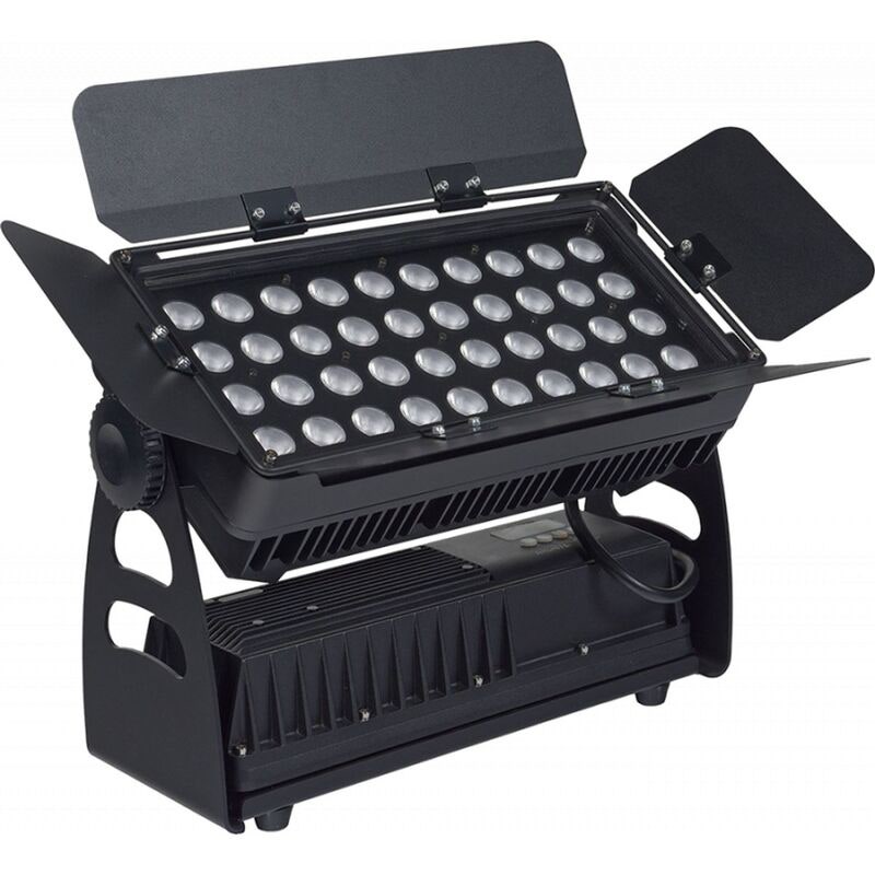 Artikkelnummer 1091362LED vask, 40x15W RGBW, IP65, barndoors, tiltstativ, OMEGA-fästen, 437x190x290 mm, 10 kg