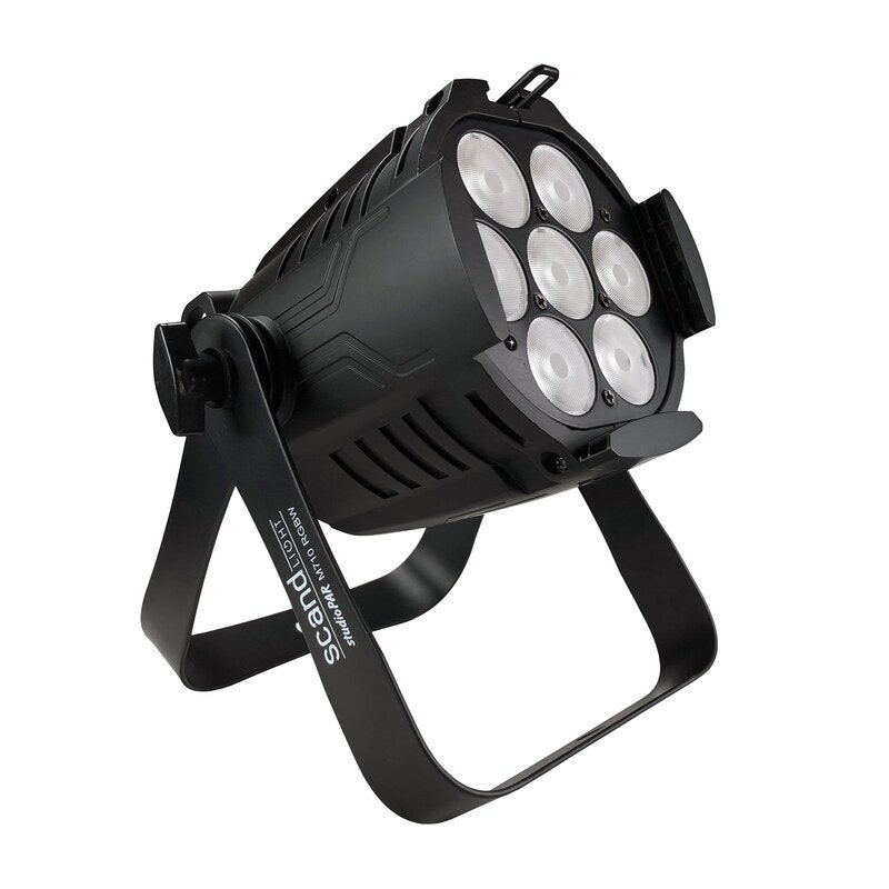 En kraftfull og stilig mini studio lydarmatur i lekker design fra Scandlight. Kassen er støpt i aluminium, og armaturen er utstyrt med hele 7 kraftige 10W RGBW LED-dioder. Scandlight studioPAR M710 RGB+W kan styres i DMX, Auto, Master/Slave eller lydstyringsmodus. Kan enkelt kontrolleres med den medfølgende fjernkontrollen. Armaturen er utrolig lyssterk til tross for sin smidige størrelse. Mange innstillingsmuligheter og bruksområder. Den stillegående viften gjør at den passer spesielt godt til lokaler hvor det skal være stillhet. Passer perfekt for å fargelegge vegger, lokaler, studioer, band, scener m.m.