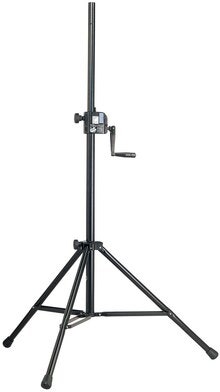 Sort høyttalerstativ med innebygd fjærsystem som forenkler rigging av høyttalere. Sort.