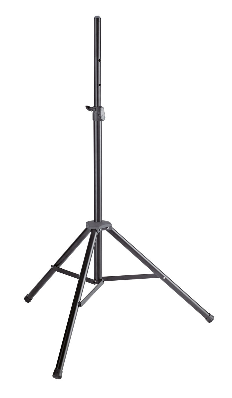 Stabilt og robust høyttalerstativ med aluminiumsrør. Pålitelig baserør med 35 mm diameter og store gummiende-kapsler sikrer et stabilt og sikkert stativ. Den kompakte klemming med det patentert push-button-systemet gjør høydejustering enkelt for brukeren. Klemmen skruen gir ekstra stabilitet og vibrasjonsfri holdning av høyttaleren. Ytterligere spesialfunksjoner er uttrekkbar beskytter for forlengerøret, den integrerte støtdemperen og monteringshjelpen for høyttalerkabinettene. Stativet er sammenleggbart for enkel transport.