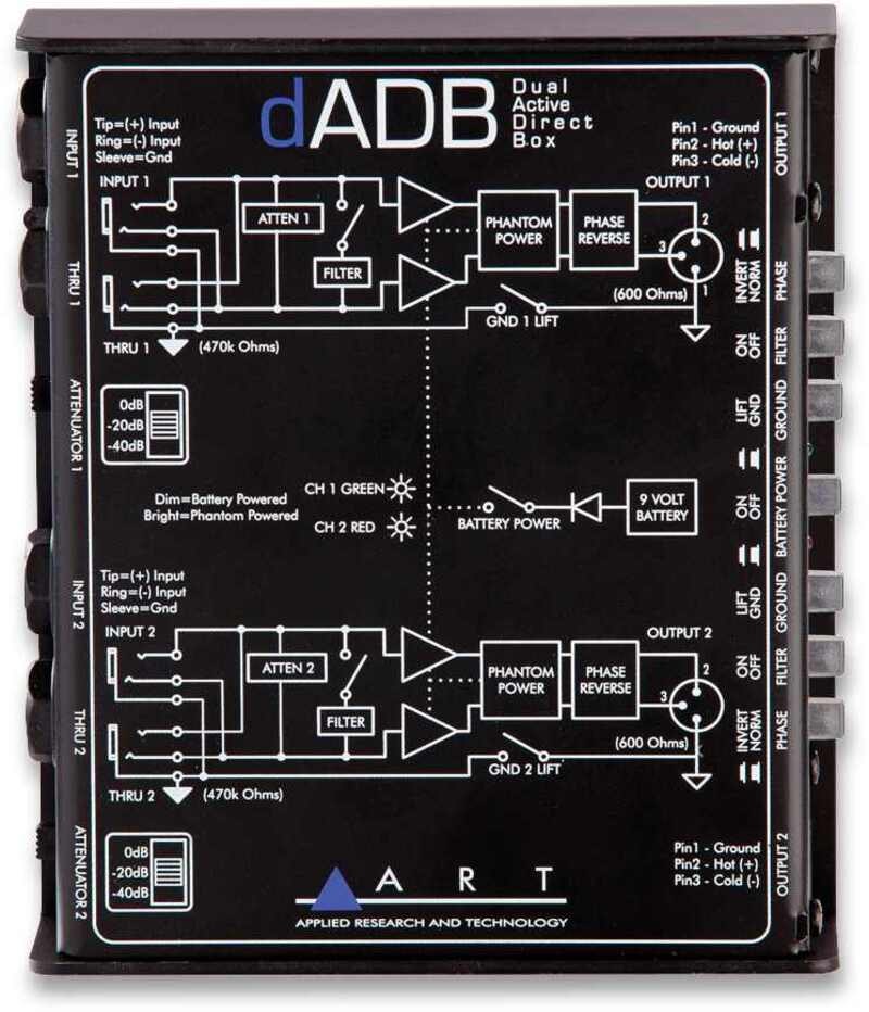 ART dADB dual aktiv direktettingsboks fungerer som to uavhengige, høykvalitets aktive grensesnitt for tilkobling av instrument-, linje- eller høyttalernivåsignaler til balanserte innganger. De høimpedans ¼-toms inngangene er bufferet og konvertert av ekstremt lave støyaktive elektroniske komponenter for å levere isolerte, balanserte, lavimpedans utganger.