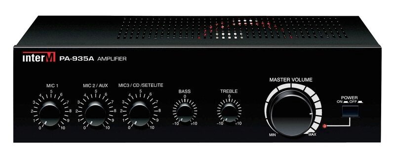 35 W mikserforsterker med 3 mikrofoninnganger, 2 AUX-innganger og en inngang for tilkobling til telefonnettet og prioriteringsfunksjon.