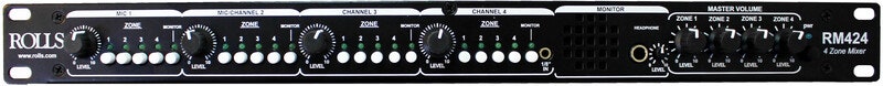RM424 Four Zone Mixer kombinerer to mikrofoner for varsling med to linje-kildeinnganger. Hver inngang kan velges med bryter for å sende lyd til hvilken som helst kombinasjon av fire soneutganger. Utgangene er alle balanserte XLR-kontakter, og Remote Volume gir hver sone mulighet for ekstern volumkontroll. Mikrofoninngangene har valgfri ducking for varsling. Frontpanelet har høyttaler for forhåndsdefinert overvåking av hver kanal med individuell bryter for hver. RM424 er enkel å bruke fra fronten, men bakover er den akkurat kompleks nok til å dekke selv de mest krevende fire-sone installasjonsbehov.