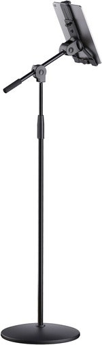 Stabilt nettbrett-/PC-stativ med plassbesparende rund base og bomarm for bruk hjemme, i studio eller på scenen. Basen på 300 mm og 4,5 kg i støpejern gir det funksjonelle stativet et sikkert fotfeste. Med fullt uttrekk pluss vertikal bomarm gir dette en maks. nettbrettstøttehøyde på 1.430 mm. Nettbrettstøtten er laget av biobasert plast. Disse plastene inneholder en andel på over 50 % opptil 100 % fornybare vegetabilske råvarer. Bruk av fornybare råvarer bidrar til å bevare begrensede petroleumsressurser og redusere skadelige CO2-utslipp. Mer informasjon om biobasert plast på: bioplastics.k-m.de. Den universelle nettbrettholderen tilbyr en brukervennlig klemmemekanisme for nettbrett med en størrelse på ca. 10" til 16" i horisontal - og ca. 7" til 13" i vertikal - orientering. Klemområdet er mellom 155 og 307 mm. Holderen egner seg også spesielt godt til bruk med nettbrett med et beskyttende deksel eller etui opp til en tykkelse på 18 mm. De overlappende klembakkene med integrert gummipute garanterer et sikkert grep og eliminerer uønsket vibrasjonsstøy. Funksjonen til betjeningselementene på enheten og nettbrettet (kun stående format) påvirkes ikke. Holderen kan vippes kontinuerlig og, takket være den fleksible bomarmen, lar hver bruker plassere den individuelt.