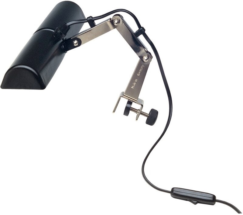 Belysning med armatur for to lamper, 3-delt arm og skruklemmefeste.