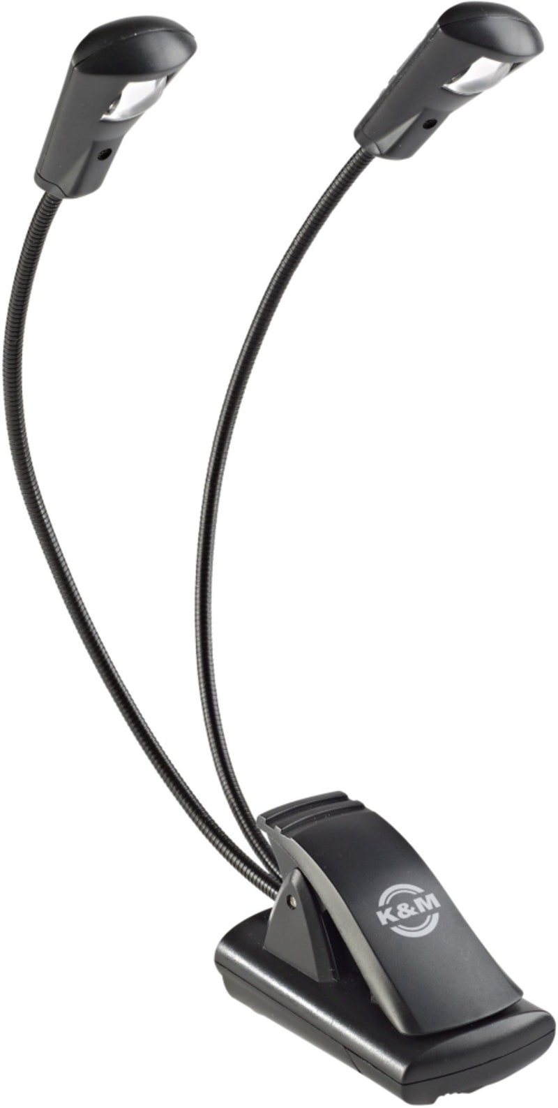 König & Meyer Music stand light "Double LED FlexLight" er en batteridrevet LED-belysning som drives med batterier. Du kan klemme den fast på materialer med en tykkelse på opptil 25mm eller sette den på en bordplate hvis du vil ha den frittstående. Passer godt til notstativ eller på et instrument, men også like bra å feste på en bok når du vil lese i mørket.
