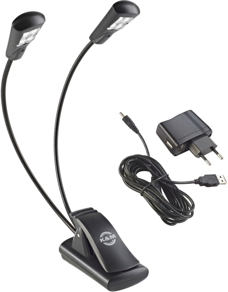 König & Meyer Music stand light "Music Stand Light Twin Head" er en batteridrevet LED-belysning som drives med batterier eller nettadapter som begge er inkludert. Du kan klemme den fast på materiale med en tykkelse på opptil 25mm. Passer godt til notestativ eller på et instrument, men også praktisk å feste på en bok når du vil lese i mørket.