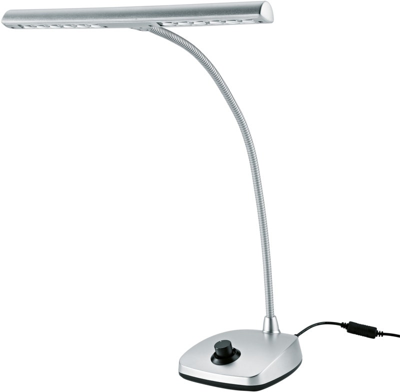 Artikkelnummer 1075106LED-belysning med varmvitt sken till piano, silverfärgad, svanhals, ca 2500 lux, gjuten metallfot, 3m strömkabel.