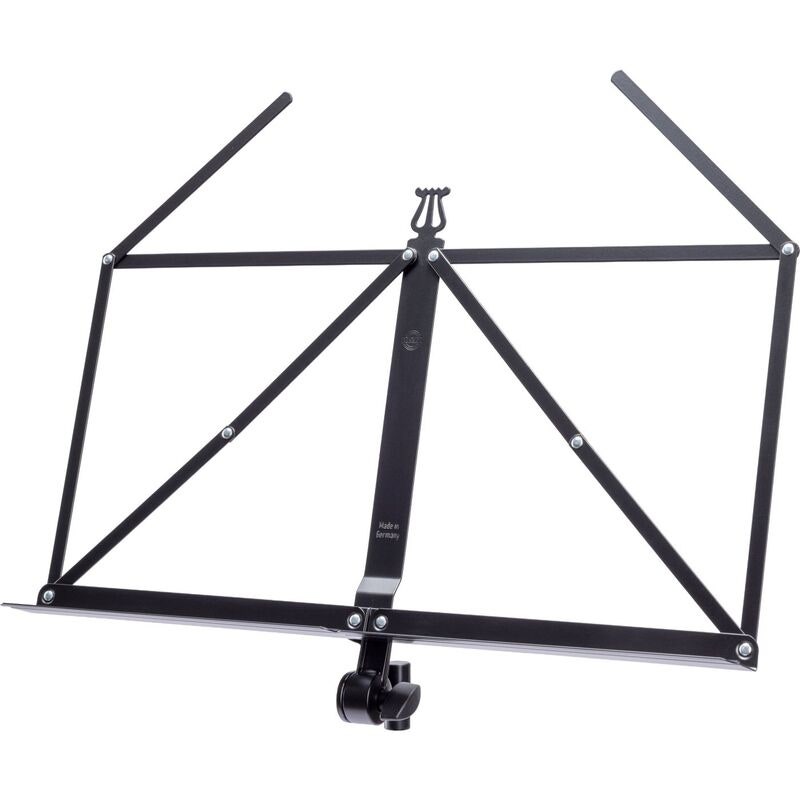 Foldable music stand desk from K&M's successful 10065 model. The robust and proven music stand desk now comes with an integrated 3/8" threaded connection and can therefore be screwed onto any solo microphone stand in no time at all. The steel music desk measures 485 x 240 x 42 mm.
