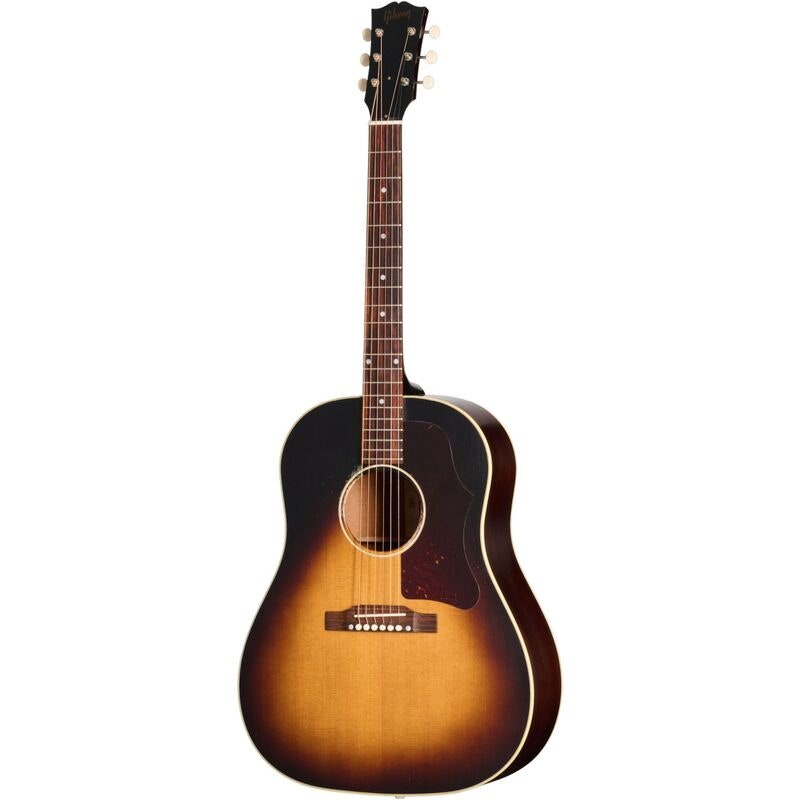 Gibson 1955 J-45 Light Aged Vintage Sunburst er en autentisk rekreasjon av modellen fra 1955 – året da J-45 fikk sitt 20. bånd og et større 50-talls plekterbrett. Den er håndlaget av Gibson Custom Shop i Bozeman, Montana, og gjenskaper lyd, følelse og utseende fra Gibsons gullalder.