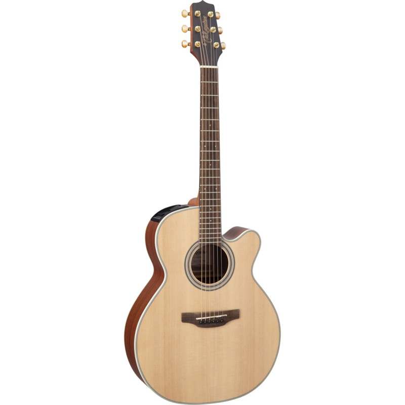 Artikkelnummer 10974033/4 steel string acoustic guitar. Sapele back and sides, solid spruce top. Takamine TP-3G preamp. Takamine GBXM gigbag.