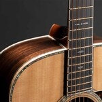 Instrumentet er bygget med et heltre granlokk, behandlet med Martins Vintage Tone System® (VTS), som aldrer treverket og gjenskaper den modne, varme lyden av en gammel gitar, helt fra første akkord. Sider og bunn er laget av indisk palisander for en rik lyd, mens grantoppen og avstivning i Adirondack-gran med VTS- og GE-scalloped-form gir respons og sustain i det øvre registeret. De utvendige egenskapene matcher tonen, flammet europeisk lønn som kanter på kropp, gripebrettet og hodestokk, abalone-innlegg rundt toppen og rosetten, snøfnugg-innlegg i abalone og perlemor langs gripebrettet og på hodet. Den gullbelagte åpne mekanikken fullfører det eksklusive uttrykket. D-45 Modern Deluxe har en asymmetrisk Vintage Deluxe halsprofil, en bro som hviler på et lag med karbonfiber for mer volum og sustain, som er ytterligere forbedret med Liquidmetal strengepinner.