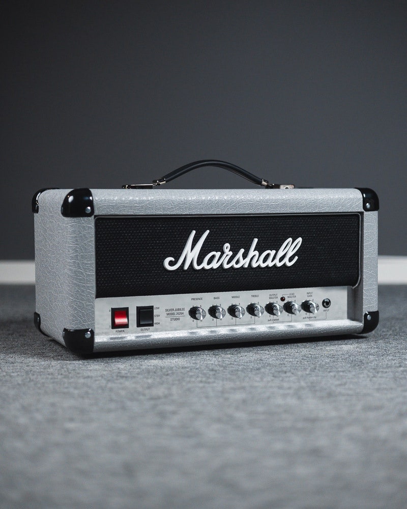 Marshall 2525H Mini Silver Jubilee er en kompakt rørforsterkertopp som gjenskaper den ikoniske Silver Jubilee-lyden i et mer fleksibelt og lettdrevet format. Modellen bygger på samme forforsterkerkrets som den anerkjente 2555X og leverer klassisk Marshall-karakter til både studio, øvingsrom og mindre scener.