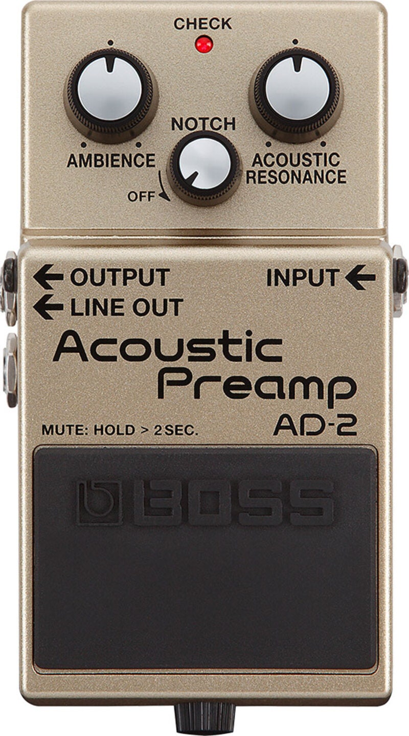 Med AD-2 Acoustic Preamp kan elektroakustiske gitarister oppleve naturlige lyder av studiokvalitet når de opptrer, uansett hvilken scene som gjelder. Utstyrt med avansert BOSS lydprosessor, har denne kompakte pedalen sofistikert kraft som langt overgår dens lille størrelse og enkle intuitive brukergrensesnitt. Acoustic Resonance gjenkaller den komplekse resonanskarakteren i din uforsterkede lyd, og Ambience gir deg profesjonelt reverb perfekt optimalisert for akustisk gitar. AD-2 har også viktige sceneverktøy som et notch filter for å kontrollere feedback, en balansert DI-utgang for direkte tilkobling til et PA-system, og en nyttig mute-funksjon for å stemme og bytte gitar på scenen.
