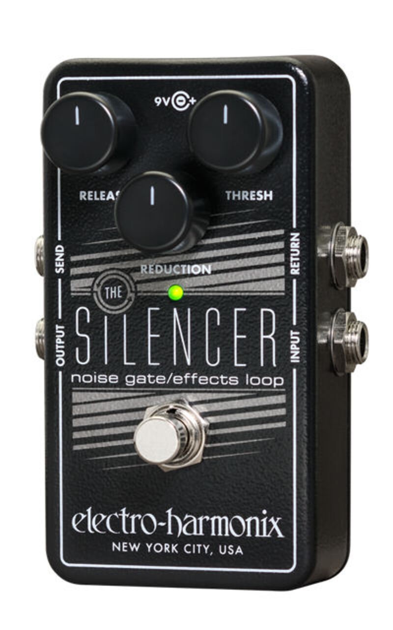 I/O inkluderer ¼ tommers Inngang, Utgang, Send og Return kontakter. Fotbryteren velger om The Silencer er aktivert eller i bypass-modus; bufferet bypass gjør at effektløkken kan forbli i signalkjeden din når gaten er bypasset. En innebygd AC-kontakt godtar en standard strømadapter som EHX 9.6DC (valgfritt), og pedalen leveres med et 9V-batteri.