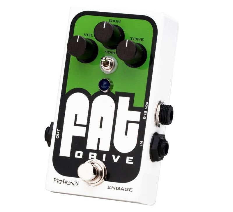 The Pigtronix Fat Drive is an all new offering that utilizes multiple gain stages cascaded to produce rich, juicy overdrive tones that drip with harmonics and respond in a truly amp-like way to dynamics and pick attack. Using CMOS clipping, the Pigtronix Fat Drive features a variable low pass filter for equalization that works in a very interactive way with the Gain control. The Tone filter is bypassed at the fully clockwise setting allowing for the natural sound of the guitar to pass through unhindered. As it’s rolled of, the highs slowly fade into the background allowing the pedal to be matched with any amp and guitar combination while never sounding muddy or muffled. The More switch allows the Pigtronix Fat Drive to go between high and low gain modes. In low gain mode the Fat Drive is totally transparent and backs off enough to be used as a clean boost as well as producing incredible low and medium gain tones that clean up with both pick attack and volume knob roll-off. The high gain mode takes on a life of its own with an almost “tweed” feel to it and tons of overtones. The Pigtronix Fat Drive is a versatile, dynamic overdrive pedal that gives true amp-like response and a wide variety of tonal shades that can be used in most any style of music.