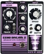 The Echo Dream 2 er en oppdatert versjon av en av Death by Audio's mest populære pedaler, som leverer 20 til 1 200 millisekunder med flott ekko, fuzz, og fullt kontrollerbar pitch-shifting modulasjon, alt i ett pedal. Kontroller for forsinkelsestid, feedback og forsinkelsesmiks gir et vakkert eterisk ekko. Skru av Wet/Dry-bryteren for justerbar blanding av forsinkelse og tørrt signal opp til en 50/50 miks, eller et fullt effektsignal for bruk med en blandet loop. Juster Fuzz-kontrollen for det fulle området av skitt fra rent til overdrive til full fuzz. Deretter kan du finjustere modulasjonens hastighet og dybde for å oppnå det perfekte nivået av utvidende pitch-shifting-farge, og vri bryteren for sinus- eller firkantbølger. The Echo Dream 2 bruker bare 40 milliamp når den er koblet til med et standard 9V-batteri, men vi anbefaler uansett en standard negativ sentrum 9VDC-strømforsyning som kan levere 18 volt for enda bedre klarhet, tone og headroom.