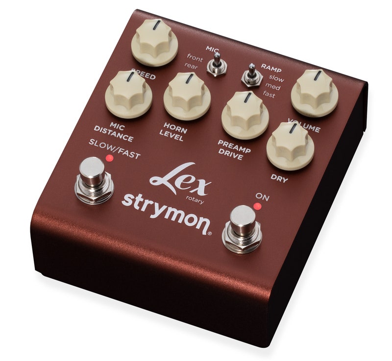 Lex V2 – en stor oppgradering som legger til dedikerte knapper for både utgangsvolum og Dry Level for å blande våt/tørr-signaler sømløst, noe som er en kraftig forbedring. Strymon har også lagt til brytere for Speed Change Ramp-Time (slow/med/fast) og Front/Rear kabinettriktning, noe som gjør den mer allsidig og brukervennlig. Speed-knappen justerer nå hastigheten for både Slow og Fast modus, avhengig av hvilken modus som er aktiv når knappen justeres.