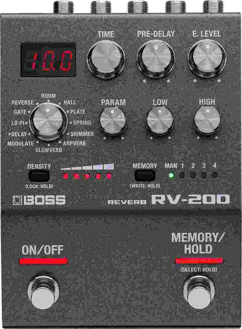The RV-200 leverer inspirerende reverbs og førsteklasses lyd i det strømlinjeformede designet av BOSS 200-serien. Tolv allsidige reverb-typer — inkludert den nyskapende Arpverb — tilbyr alt fra subtile romlige farger til komplekse, drømmeaktige teksturer for ambient utforskning. Raskt still inn lydene med brukergrensesnittet for rask tilgang. Lagre favoritter i 127 minnesplasser. Og ta opptredener til neste nivå med fleksible innebygde footswitcher, omfattende ekstern kontrollstøtte og kreative verktøy som Warp, Twist og mer.