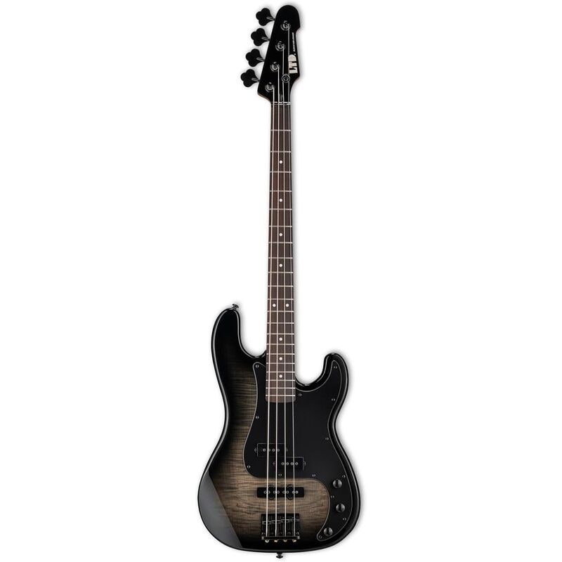Elbass 4-strengers, bolt-on-konstruksjon i 34" mensur, poplar-kropp med burled poplar-topp i Black Burst, roasted maple-hals med Thin U-profil, rosewood-gripebrett med 21 extra-jumbo bånd