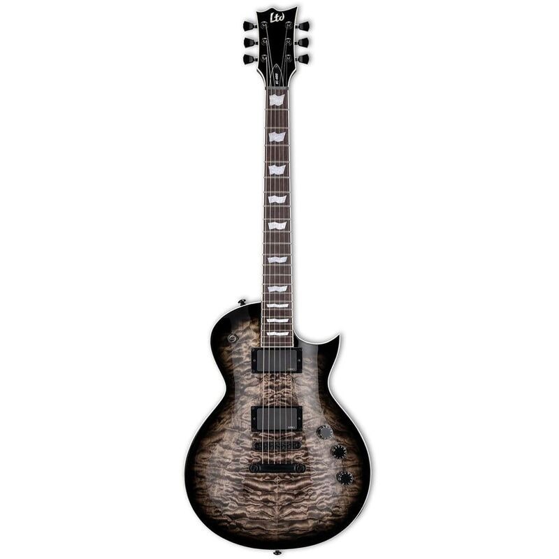 LTD EC-400QM kombinerer ESPs klassiske single-cut-form med profesjonelle komponenter og solid byggekvalitet. Set-thru-konstruksjonen i 24,75” skala gir jevn tilgang til de høyeste båndene, mens mahognykropp med quilted maple-topp gir både respons og et tydelig visuelt uttrykk i See Thru Black Sunburst-finish. Gitaren er utstyrt med EMG 81 i broposisjon og EMG 85 i halsposisjon.