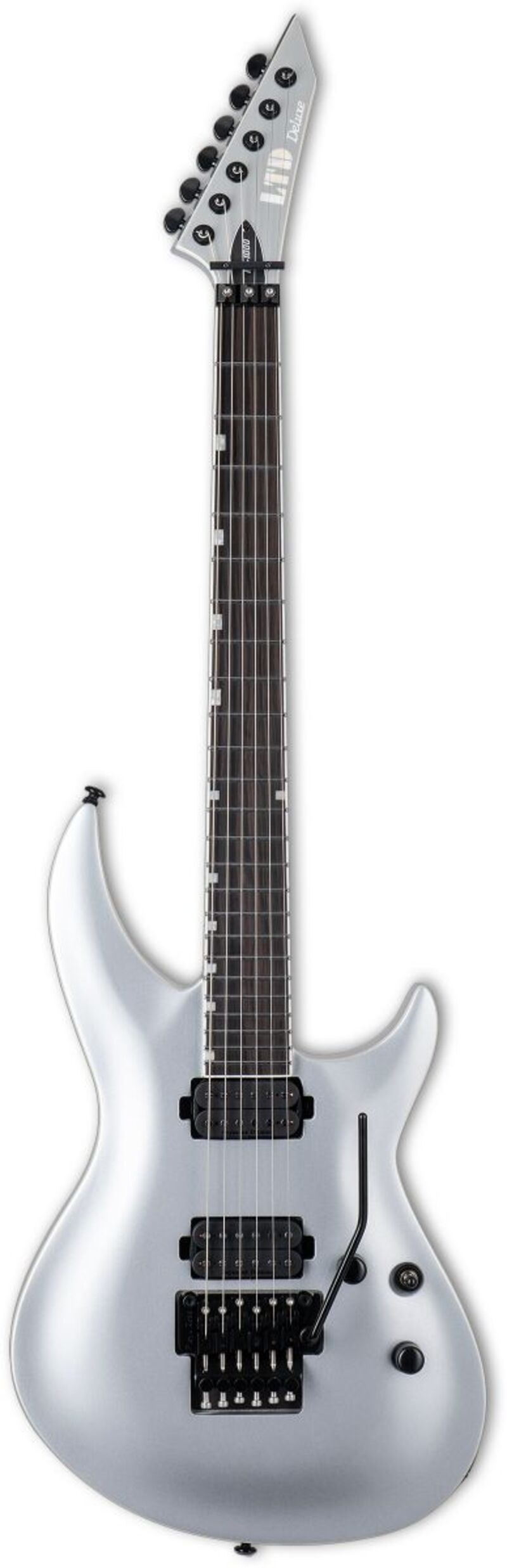 With the LTD H3-1000FR, you get the bold curves of the ESP Horizon-3, a unique and original look with an extended and beveled upper horn and a shortened lower horn that offers excellent high-fret accessibility. This guitar offers set-thru construction at 25.5” scale, pairing a mahogany body to a three-piece, extra-thin maple neck that has a compound radius for maximum speed and comfort. White body, neck, and headstock binding adds a great-looking contrasting aesthetic. The H3-1000’s Macassar ebony fingerboard features offset white pearloid block inlays and 24 extra-jumbo stainless steel frets. Its components include a Floyd Rose 1000 SE double-locking tremolo with stainless steel screws, and precise Grover tuners. The direct-mounted pickup set on the H3-1000FR is truly special. Its bridge pickup is a Seymour Duncan Custom 14, a new pickup made exclusively for ESP that offers high output and extraordinary tonal balance with mind-blowing articulation and clarity, and is splittable with a push-pull control on the tone knob. The Custom 14 is paired with a cosmetically-matching Seymour Duncan APH-1 Alnico II Pro humbucker in the neck position, a legendary pickup that offers a warm tone that is smooth and full, with tons of natural sustain.