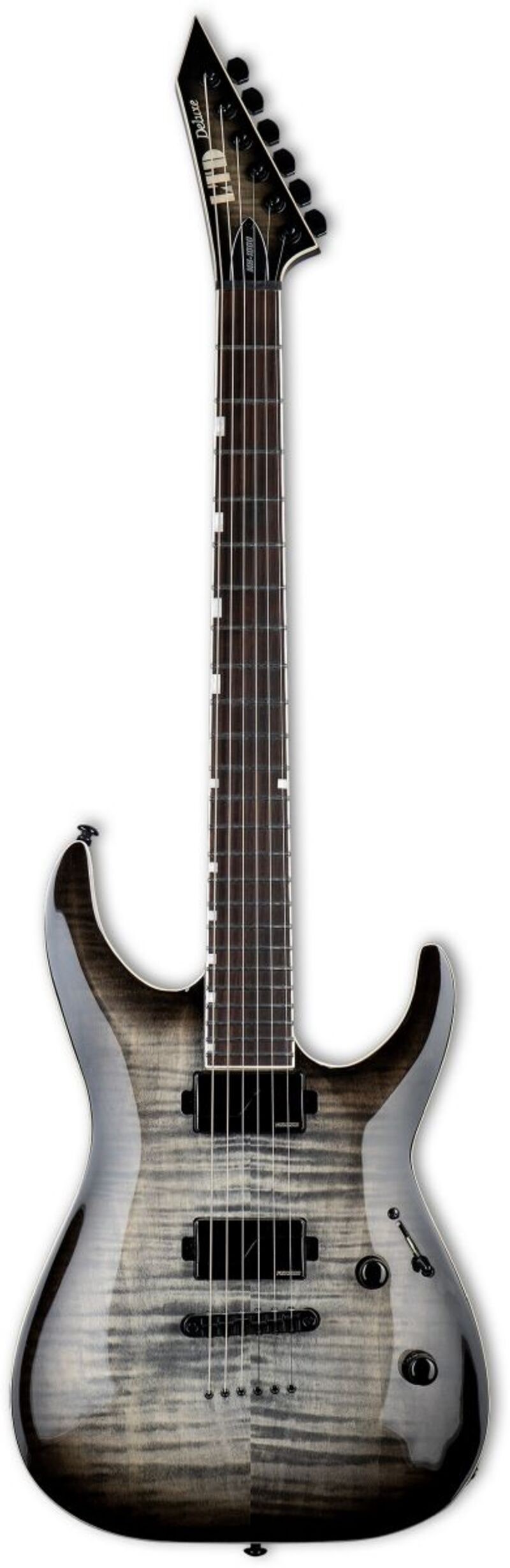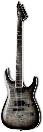 The LTD MH Series combines design elements of ESP’s H/Horizon models, like its archtop body, and from the M/Mirage guitars, like its inline headstock and extra-thin u-shaped neck. The result is a guitar that can do no wrong for any style of music. The MH-1000NT features set-thru construction at 25.5” scale, allowing for smooth and fast access to the highest frets. It offers a mahogany body with flamed maple top, finished in a translucent Charcoal burst finish to allow the figured wood to be a highlight, with white binding on the body, neck, and reversed headstock. The MH-1000NT has a sturdy thin u-shaped three-piece maple neck, and a Macassar ebony fingerboard with offset block inlays and 24 extra-jumbo stainless steel frets. Black hardware and components on this excellent guitar include a TonePros locking TOM bridge with string thru body, LTD locking tuners, and a set of direct-mounted Fishman Fluence Modern Humbucker active pickups (ceramic in the bridge and alnico in the neck), with push-pull control to select voicings and black nickel covers to match this guitar’s outstanding aesthetics. Each pickup offers two voices. With the ceramic bridge pickup, Voice 1 is the ultimate high-output ceramic humbucker bridge pickup tone… crisp, searing crunch, tight bass with no mud, and a growl. Voice 2 delivers modern passive attack performance that has superbly organic distortion characteristics with outstanding dynamics and response. The alnico neck pickup’s Voice 1 is Fishman’s modern active high-output tone, offering the ideal active alnico sound: full, round, and boosted, but with unprecedented articulation and dynamics. Voice 2 gives you the crisp, clean and fluid neck humbucker tone you’ve always wanted.