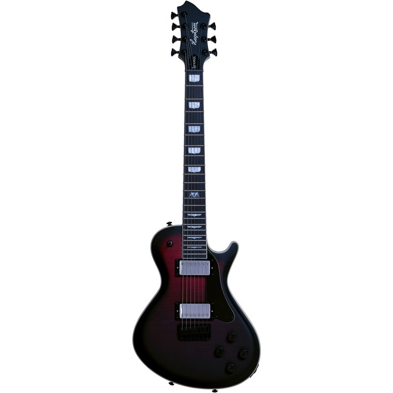 Artikkelnummer 1096388Electric guitar, 7-stringed, mahogany body, maple top with flame maple veneer, Canadian maple neck, Resinator fingerboard, Agent‑X7 & Penetrator‑7 humbuckers, Hagstrom Hardtail‑7 solid brass bridge (string‑through)