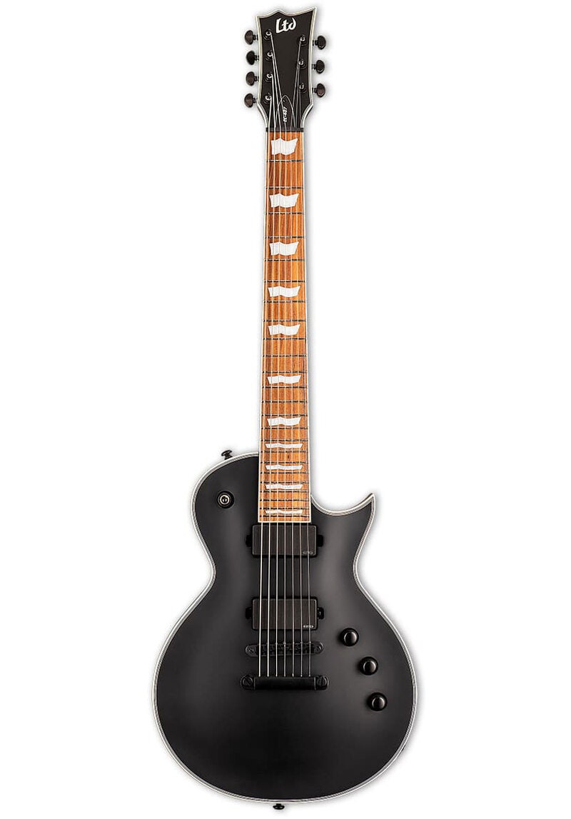 The world of 7-string guitars has exploded in recent years, with many players in the hard rock and metal community enjoying the extended low range that the extra string provides. The LTD EC-407 was designed for performance with exactly these things in mind. The 3 pc. maple neck and mahogany body with maple cap ensure that even your lowest notes will stand out to the crowd. In addition, you get an attainable way to get into professional 7-string playing, with premier construction and active electronics (EMG 81-7H / 60-7H). Available with matching black satin hardware, and 24 XJ fret pau ferro fingerboard.