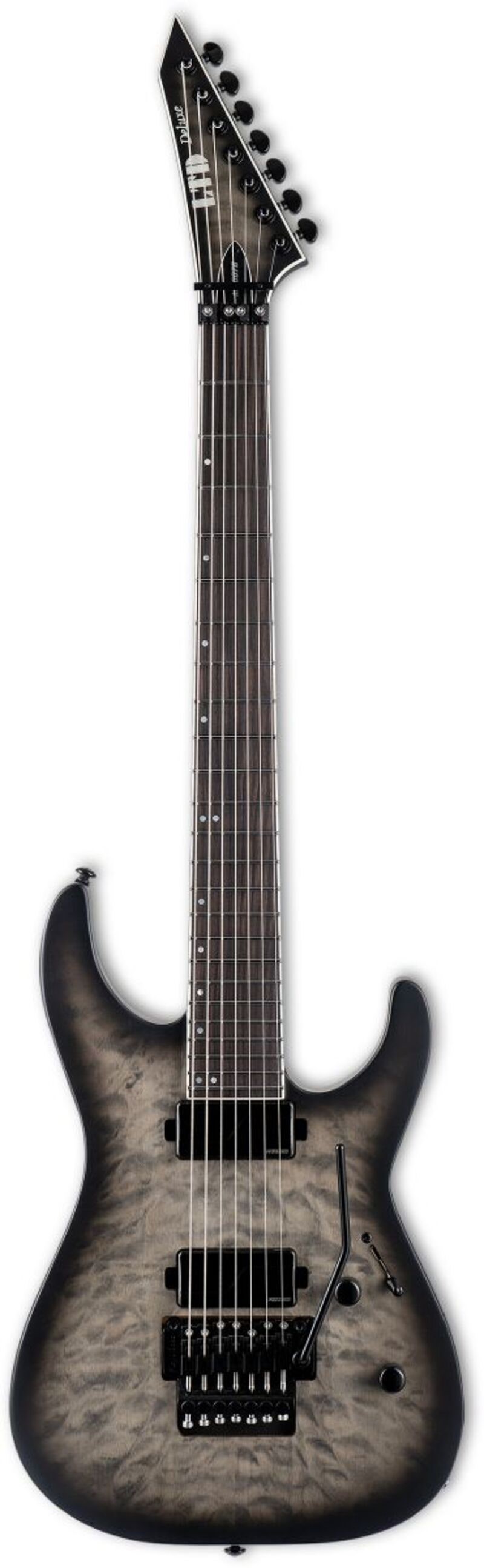 For dere som liker å utforske dypet av utvidede stemminger, er LTD Deluxe M-1007 Baritone en sterke kandidat for din neste gitar. Med set-thru-konstruksjon for uforstyrret tilgang til de høyeste båndene, er M-1007 baritone en syvstrengs gitar bygget med en full 27” baritonskala, noe som tillater ekstrem nedstemt tuning samtidig som det opprettholder utmerket strenge-spenning. Den tilbyr en behagelig og resonant alkropp i alder med en fremragende quilted maple topp, og en super-tynn u-formet tre-delt lønn-aktig nakke. Den har et bundet Macassar ebony fingerboard med forskjøvete perlemorsdot-inlays og 24 ekstra-jumbo rustfrie stålfrets, samt en bundet, matchende finish reverse headstock. Komponenter på M-1007 Baritone inkluderer en Floyd Rose 1000 SE dobbel-låsnings tremolo med rustfrie skruer og presise Grover-tuners. Lyden drives av et sett med direkte-monterte Fishman Fluence Modern Humbucker aktive pickups (keramikk i broen og alnico i nakken), med push-pull-kontroller for å velge stemninger og svarte nikkel-deksler for å matche gitarens fremragende estetikk. Hver pickup tilbyr to stemmer. Med den keramiske bridge pickupen er Voice 1 den ultimate høygjengende keramiske humbucker-lyden: klar, brennende crunch, stram bass uten mud og et growl. Voice 2 leverer en moderne passiv angrepsytelse med utmerket organisk forvrengning med fremragende dynamikk og respons. Alnico nakke-pickupen har Voice 1 som Fishman sin moderne aktive høygjengende tone, som gir den ideelle aktive alnico-lyden: full, rund og forsterket, men med enestående artikulasjon og dynamikk. Voice 2 gir deg den skarpe, rene og flytende nakke humbucker-lyden du alltid har ønsket.