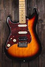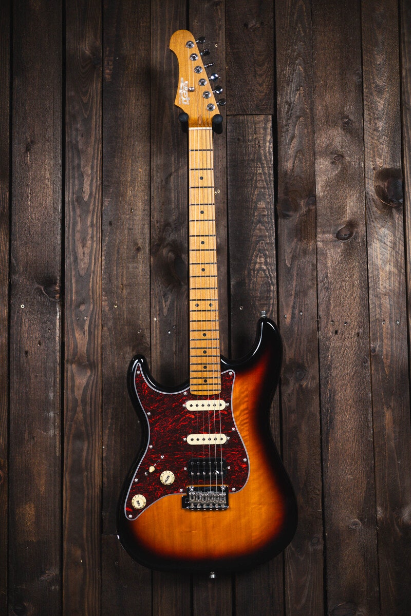 Artikkelnummer 1095534B-Stock, venstrehendt elgitar, basswood-kropp, roasted Canadian maple-hals, Modern C-profil, HSS keramiske mikrofoner, 2-punkts tremolo, Sunburst-finish, full garanti