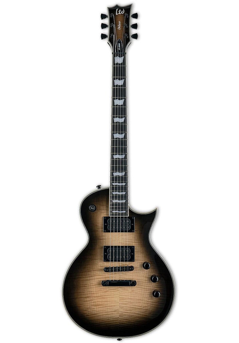 Gitarer i LTD 1000-serien er designet for å tilby den tonen, følelsen, utseendet og kvaliteten som profesjonelle musikere krever i et instrument, og LTD EC-1000 har jevnlig vært blant verdens mest populære gitarer i over 20 år ved å levere den høykvalitets enkeltcutaway-gitarmodellen, spesialdesignet for seriøse musikere til en pris alle har råd til. «T»-emer i EC-1000T står for «traditional», som betegner det fulltykkede kroppsdesignet uten buktning i magen, men den er kammeret for vektlette og komfortable konserter og innspillingsøkter. Den har en flamed maple-hette på sin mahogny-kropp, med en tre-delt mahogny-nek og Macassar ebony-fingerbrett. EC-1000T får sin tone gjennom et sett med høygjeldende Seymour Duncan Sentient (pickup hals) og Pegasus (pickup bro) passive pickups, som kan splittes med en push-pull-kontroll, for imponerende lyder til metal, rock, fusion, progressiv og andre sjangre. Den inkluderer flagg-inlays, full kropp/nekke/hodestokkbinding, og førsteklasses komponenter som LTD låsbare stemmeskruer og en TonePros låsing TOM-bridge og haleplate. Tilgjengelig i Black Natural Burst finish.