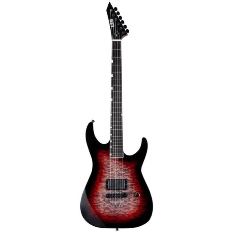 Den LTD JM-I i Deep Blood Moon-finish med quiltet lønntopp tilbyr en kraftfull kombinasjon av moderne spillbarhet og høykvalitets elektronikk. Gitarren har en alu-kropp og en tre-delt rosta lønnhals med bolt-on-konstruksjon og 25,5” skala, noe som gir stabilitet og holdbarhet. Greppbrættet i Macassar-ebony har 24 ekstra jumbo-bånd i rustfritt stål og Luminlay-side markers for bedre synlighet i mørke miljøer.