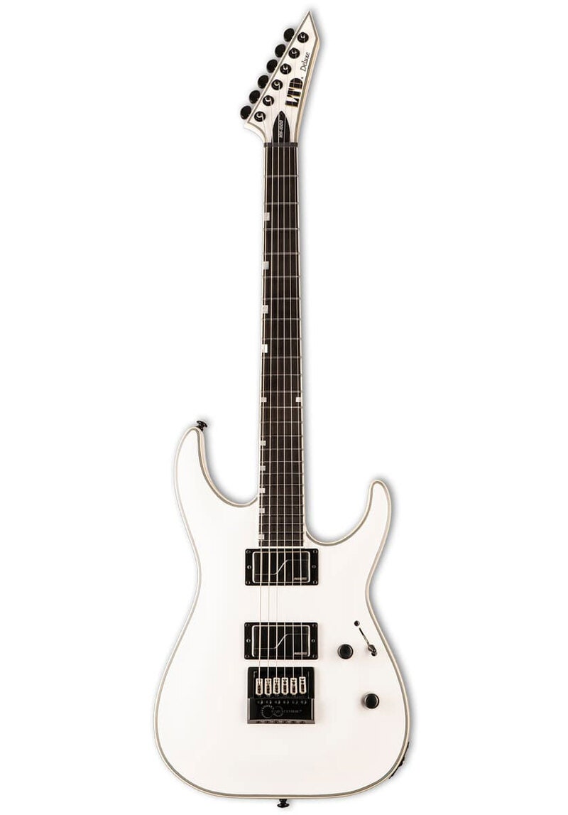 LTD Deluxe gitarer er designet for å tilby tone, følelse, utseende og kvalitet som profesjonelle musikere krever i et instrument, samtidig som de er rimelige nok for seriøse spillere. LTD MH-1000 EverTune Snow White er klar til å rocke, med set-through konstruksjon av en mahognykropp med lønnskap, og multibinding på kroppen, halsen og matchende finish på hodekroken. Dens Macassar ebony-fingerbord har 24 ekstra-jumbo rustfrie stålfrets. Denne MH-1000-modellen har EverTune konstant spenningsbro, som holder gitaren i stemning på alle punkter på fingerbrettet i nesten alle miljøer. Andre komponenter inkluderer Grover-trenere, og et sett Fishman Fluence Modern Humbucker pickups (alnico i halsposisjonen, keramikk i broposisjonen). Disse allsidige aktive pickups kan produsere en rekke flotte toner, med flere stemminger som kan velges via en push-pull kontroll.