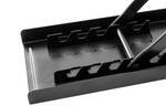 Ovansiden er gummiert for at du ikke skal gli med foten, du kan justere høyden i fem ulike posisjoner for å finne en perfekt stilling for deg & du kan enkelt legge den sammen slik at den blir nesten helt flat & får plass i f.eks. gitarvesken når du er ute på eventyr. Pallens ben er utstyrt med gummiføtter slik at den ikke skal gli av når du bruker den.