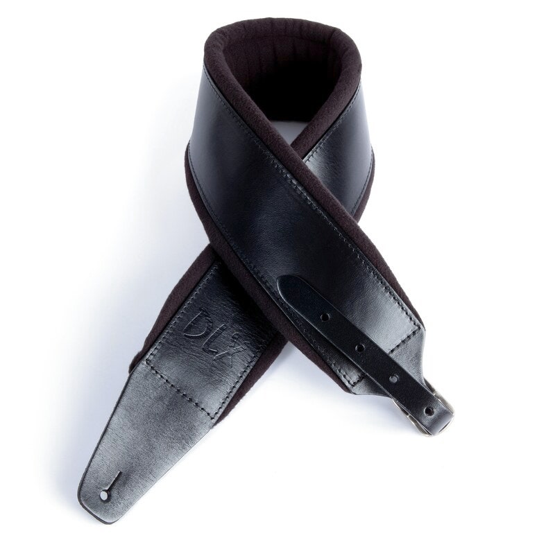 Artikkelnummer 10663183" wide Pro Guitar Strap med førsteklasses italiensk lærret øverst og skumfôret bakside. Svart med varmepreget DLX-logo.