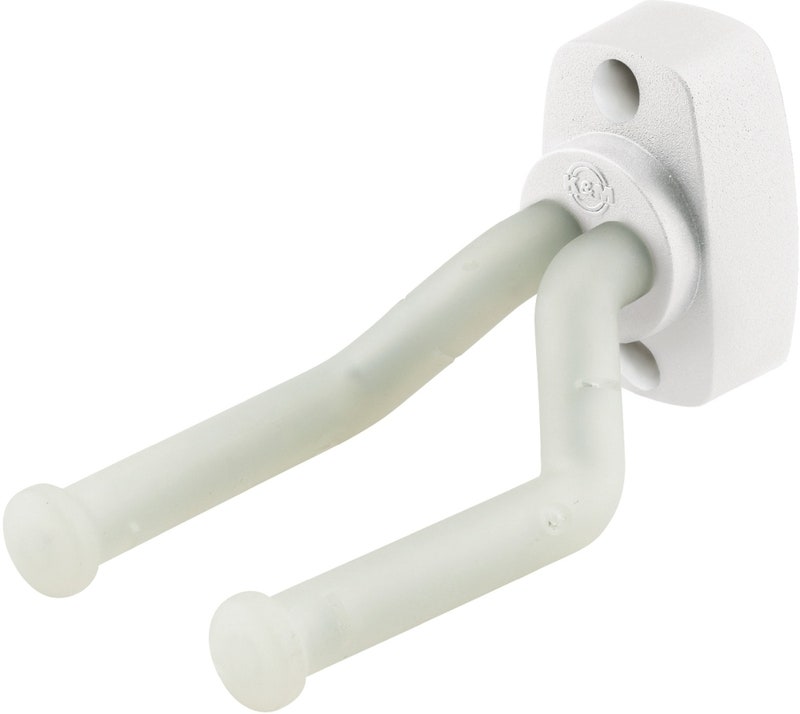 Elegant hvitt veggfeste for gitar med transparent opphengsbøyle.