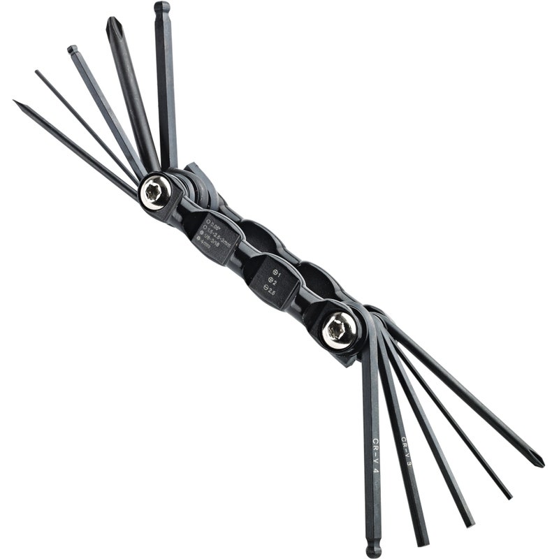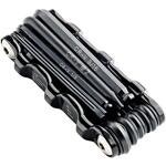 Et allsidig gitarverktøy med forskjellige unbrakonøkler i tommer og metriske størrelser og forskjellige skrutrekkere.