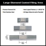 Den lave profilen i rustfritt stål gjør at du enkelt får et godt grep tett inntil slipeflaten, noe som gjør selve slipingen tryggere og mer presis. På oversiden er det markeringer for den underliggende slipeflaten slik at du alltid vet hvordan du skal file.