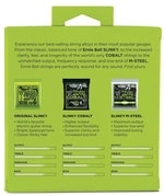 The Ernie Ball Electric Guitar String Tone Pack is the perfect way to experience three legendary electric guitar tones. From the world's #1-selling Original Slinky strings, featuring classic, balanced tone, or the Cobalt Slinky Strings, providing higher output and superior clarity, to the M-Steel Slinky strings, which are the loudest, most expressive strings ever created. Three tones. One Pack. Famously Slinky.