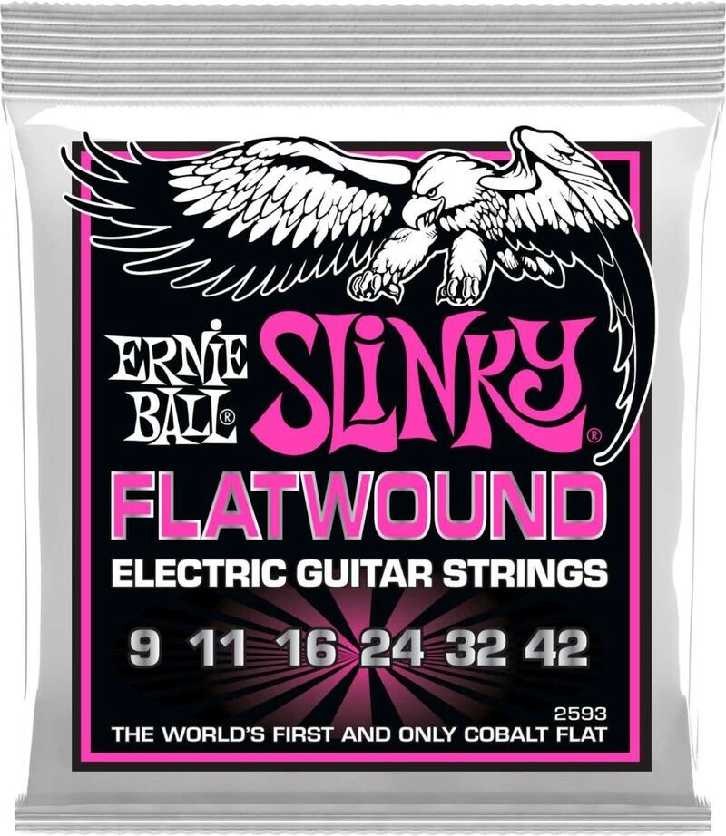 Ernie Ball Flatwound for elektrisk gitar er ganske enkelt en serie strenger som føles som "slipte" strenger, men høres ut som tradisjonelle Slinkys. I tillegg har disse settene en uspunnet G-streng som gjør plukking og solo lettere.