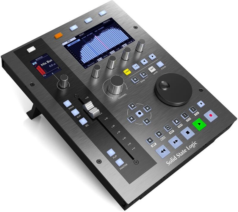 - 2 x høykvalitets skjermer, inkludert en stor 4.3” TFT LCD-skjerm for visuell tilbakemelding av DAW-sporingsnavn, parametere, tidsvisning, SSL Meter plug-in og 360°-aktiverte kanalstriper i SSL Plug-in Mixer.